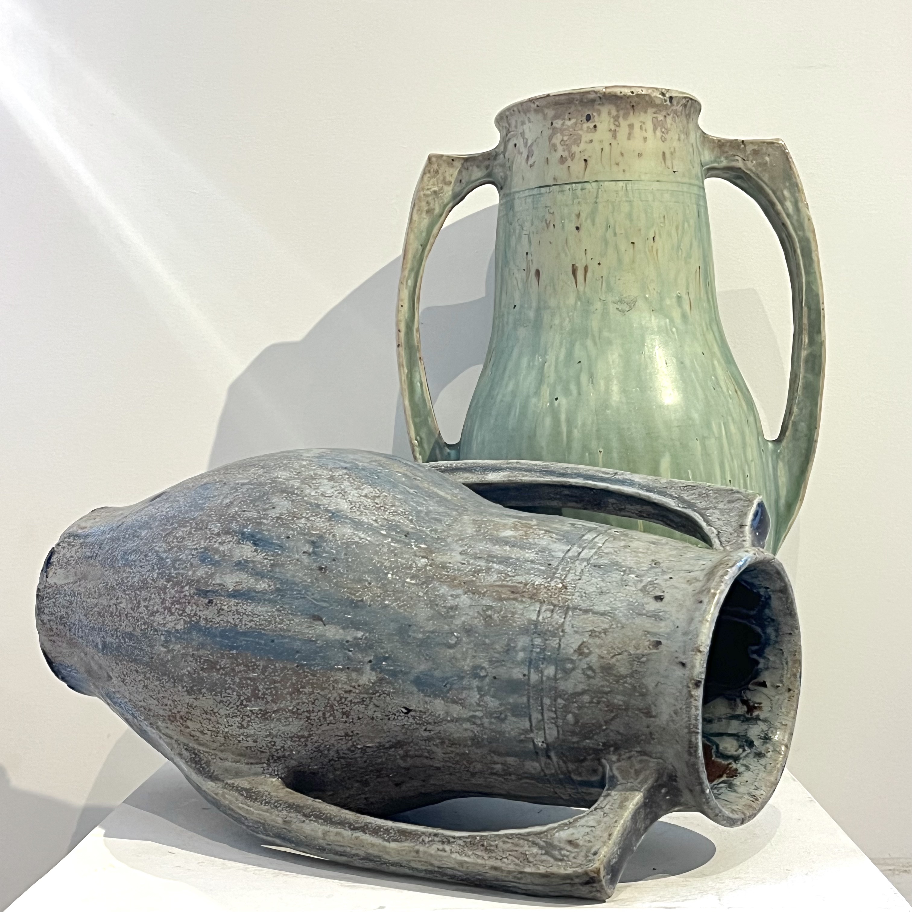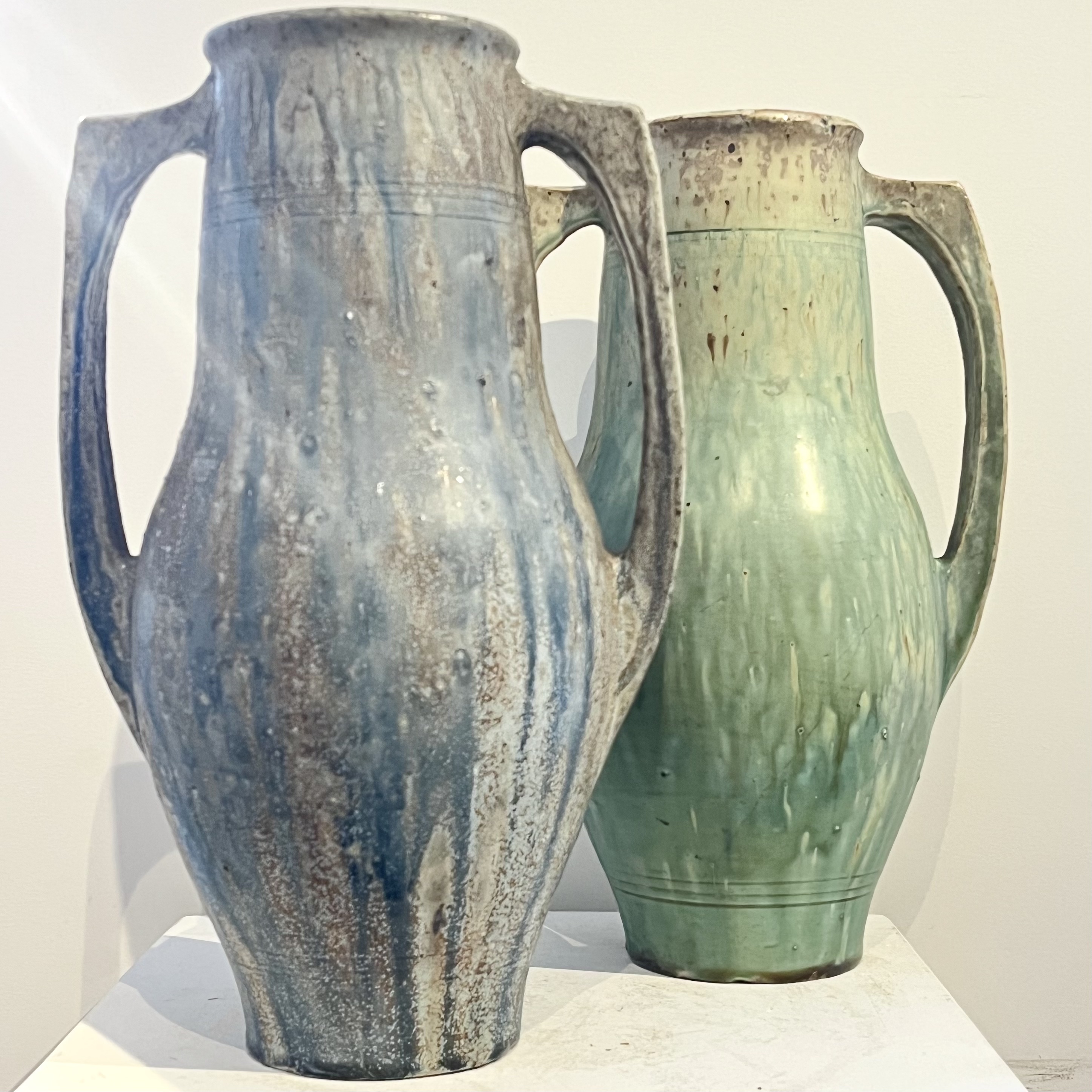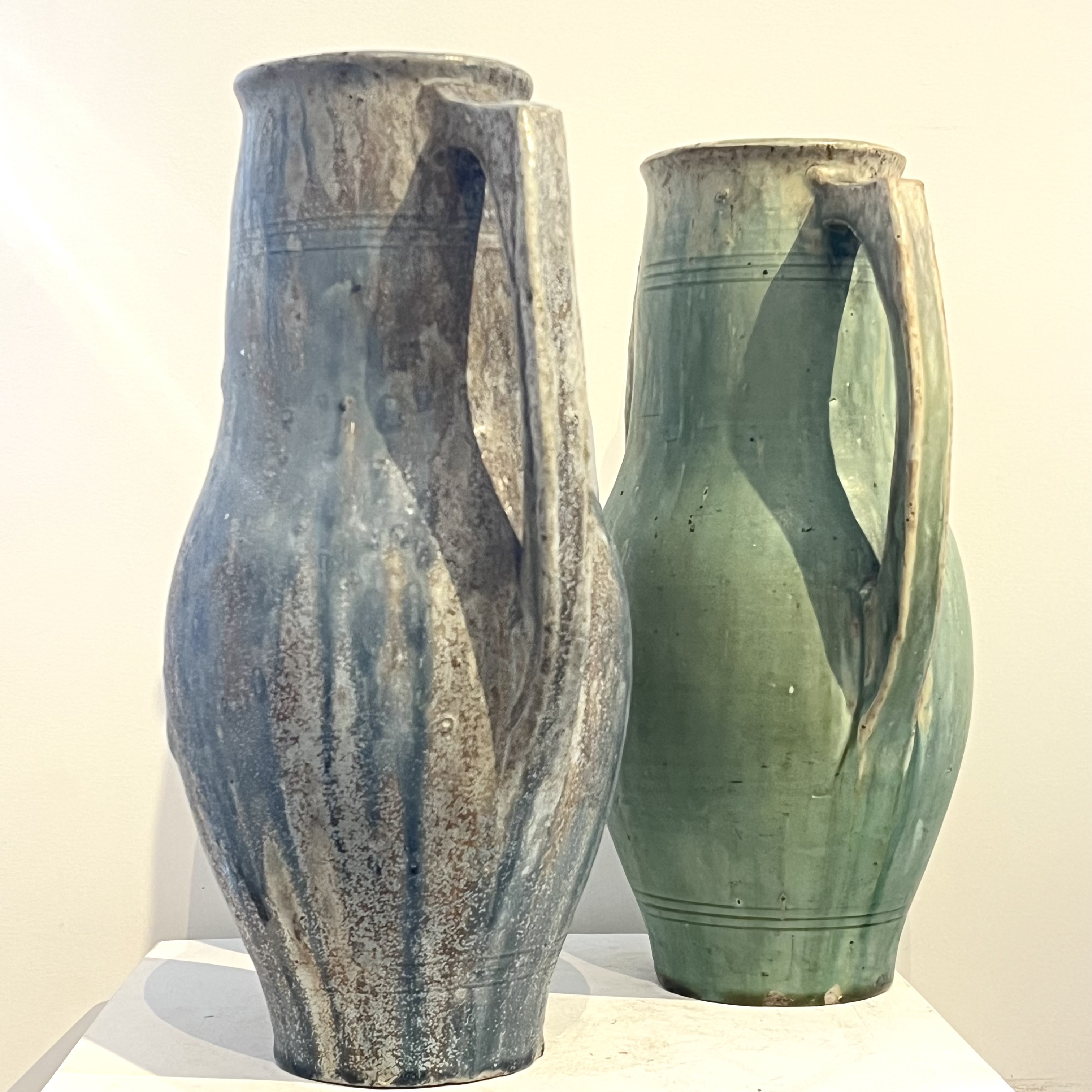 Paire de grands vases en grés a couverte émaillée bleue et verte.